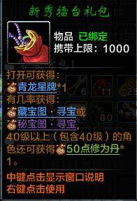 除此之外玩家还可以额外获得新秀擂台礼包,打开礼包必得到一个青龙星牌,有几率获得藏宝图,40级以上的玩家还可以获得50点修炼丹。
