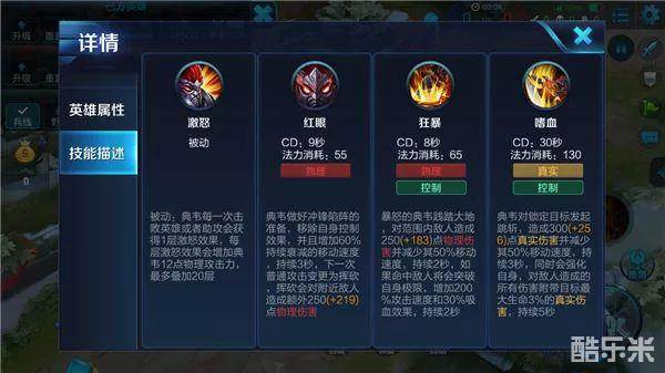 一技能-红眼:典韦短暂提高自身的移速,并移除自身的控制效果,下一次普攻将能对附近敌人造成额外物理伤害。