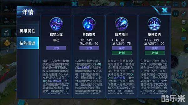 大招:堕神契约:东皇太一压制住一位敌方英雄,压制期间双方无法进行任何操作,且一方所受全部伤害另一方也能共享;释放该技能时,东皇太一会立即生成三个暗黑能量体。
