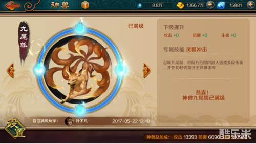 最后再为大家介绍一个卡桑最爱使用的神兽,它就是【九尾狐】。九尾狐的专属技能为“灵狐冲击”,召唤它将会对前方范围内敌人造成多段伤害,并可以在10秒内提高主将的暴击率!暴击是多么恐怖相信体验过的玩家都懂,所以卡桑建议在战斗时带一只九尾狐,万一一个暴击就把敌人一刀斩杀了呢~