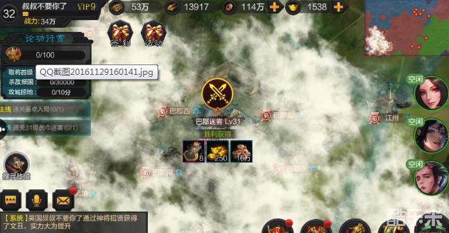 战斗结束后进入主城,在招贤馆进行武将招募,可以升级的建筑会有绿色箭头提示升级。升级完之后在右下角进入世界大地图,系统会自动帮你送至待完成的主线关卡。