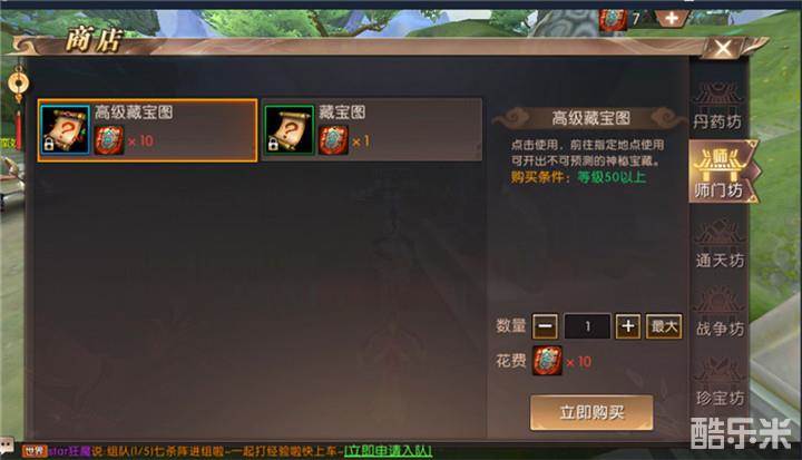 完成两大环可以获得两张师门令牌,但是不要换了普通的藏宝图,每五天可以换一个高级藏宝图,高级藏宝图可能开出金骷髅,为了避免金骷髅被抢,建议勇士们组队前往。