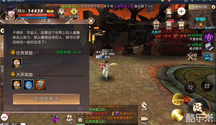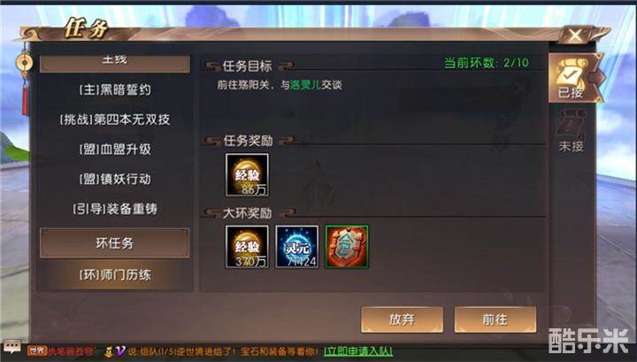 师门任务大概分为两类,一是对话任务,比如前往轩辕城,与边晋交谈,对话贾海瑞等等这些对应NPC交流,基本都在轩辕城,但也有在其他地图的;二是击杀任务,例如击杀青木城守护兽,击败马曹荣等,这类任务五千战力以上做起来,不费吹灰之力。完成起来可以点击任务列表的自动寻路,找到任务所需的NPC谈话,或者找到需要击杀的怪物。每一大环分为十次小任务,寻路完成即可非常简单,如果你实在有事,直接挂机,十五秒自动选择下一任务,一会再回来可能就自动完成了。