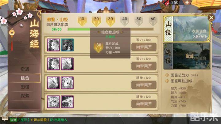 激活30个以上包括30个山经图鉴组合时可以额外获得智力+100、力量+100的属性加成;