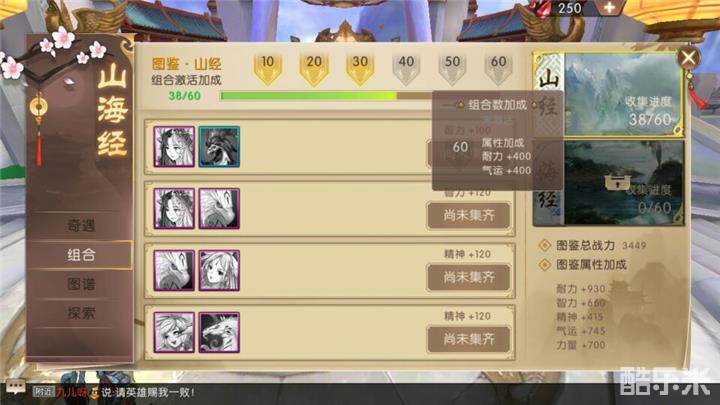 山海经组合图鉴,分山经和海经,每个都有60个组合可以激活。每激活一个组合都会给勇士相应的属性加成。下面给勇士介绍下山经图鉴组合激活数量达到一定程度的额外属性加成。
