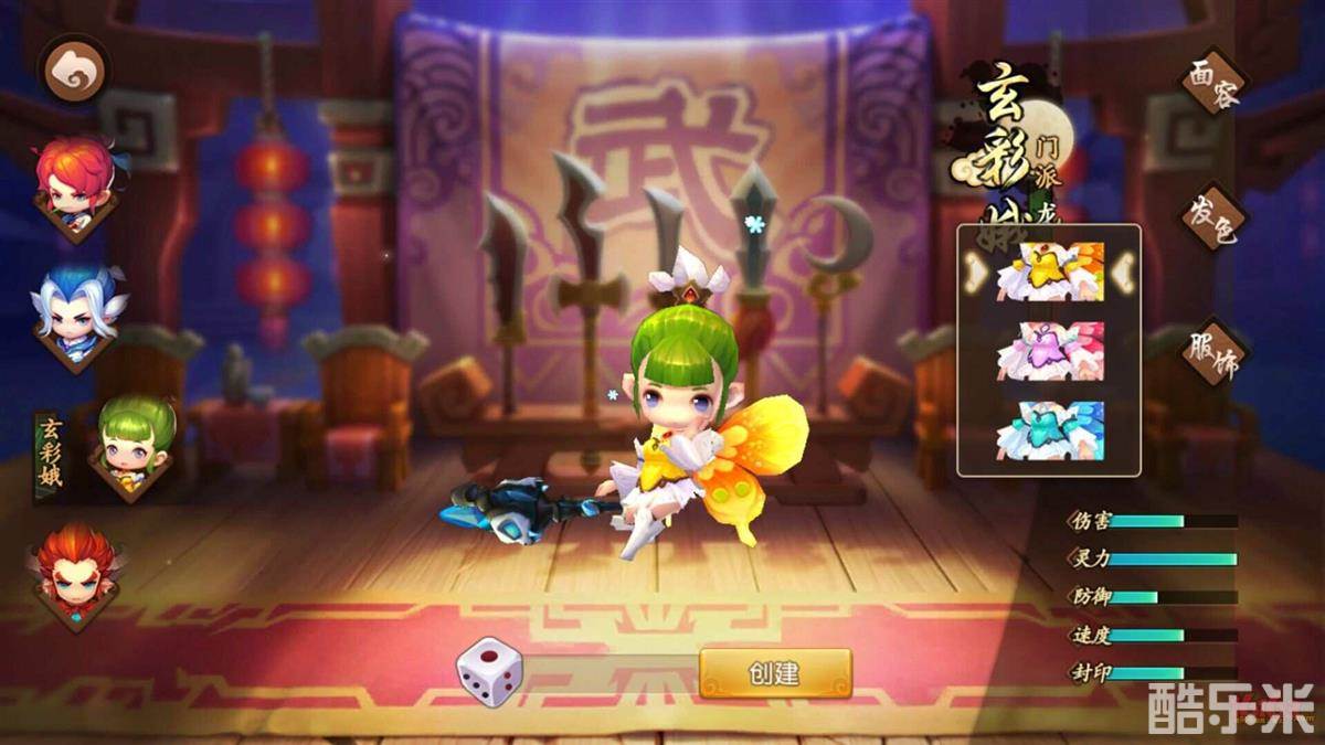 进入创建角色界面,会有四个职业分别是剑侠客(大唐,近战)、杀破狼(地府,弓箭手远程)、玄彩娥(龙宫远程)、巨魔王(狮驼岭,近战)。根据自己 的喜好选择人物和昵称。