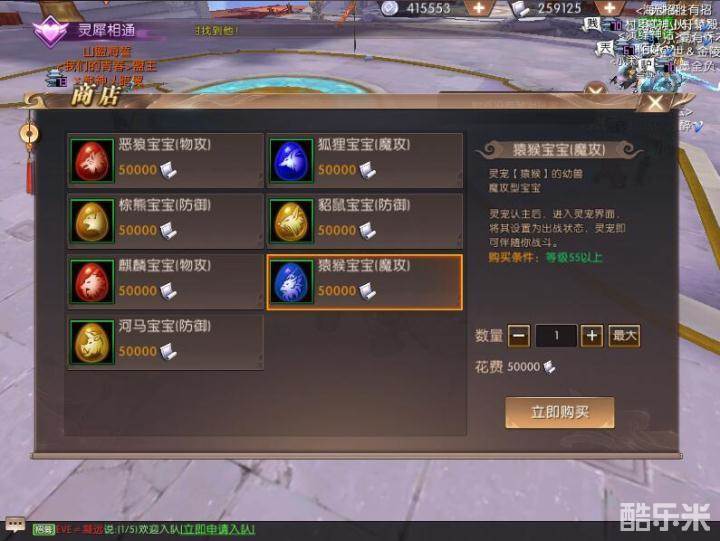 狐狸和猿猴两种灵宠的获得方式都比较简单,我们可以在灵宠界面右下角的灵宠商店中花费银票购买两种灵宠的幼兽,将灵宠认主之后进入灵宠界面,将其设置成出战状态我们就可以带着它们开始征程,灵宠就会一直伴随我们战斗了。