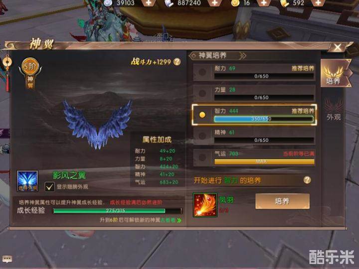 打开神翼界面之后可以看到右侧的神翼培养,耐力、力量、智力、精神和气运五种属性大家可以选择适合自己职业特点的开始培养,当培养到一定进度的时候神翼就可以进阶了,神翼进阶所需的材料就是凤羽。