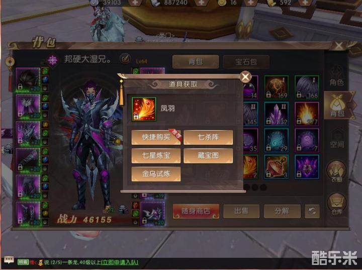在凤羽获取中我们看到,凤羽可以使用血盟工资在工资商店购买,可以在七杀阵的奖励宝箱中获得,可以在七星练宝的炼宝袋中获得,可以挖藏宝图获得,当然如果你想更快速的获得凤羽就需要购买小队金乌试炼券进入金乌副本挑战来获得。
