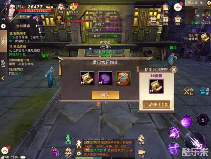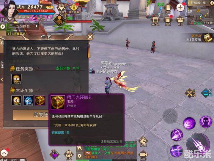 我们可以看到一位59级别的勇士接受师门任务的时候除了每环的经验奖励之外,下方的大环奖励添加了一个金色箱子,上面是师门大环赠礼,使用之后可以获得端木紫嫣赠送的丰厚礼品。到底是什么奖励呢?话不多说,我们先跑完一大环就知道拉!