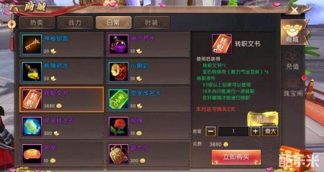 当然了,想要转换职业也不是凭空对着天空大喊就能实现的。我们完成转职需要一样道具--转职文书,转职文书勇士们可以在轩辕手游商城的日常分类下看到,花费3880金币就可以购买一个转职文书准备转职了。