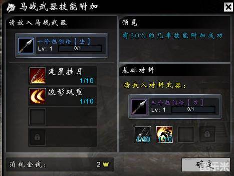 得到一把马战武器,鉴定后(10级鉴定符即可)会看到此武器拥有技能的情况,比如: