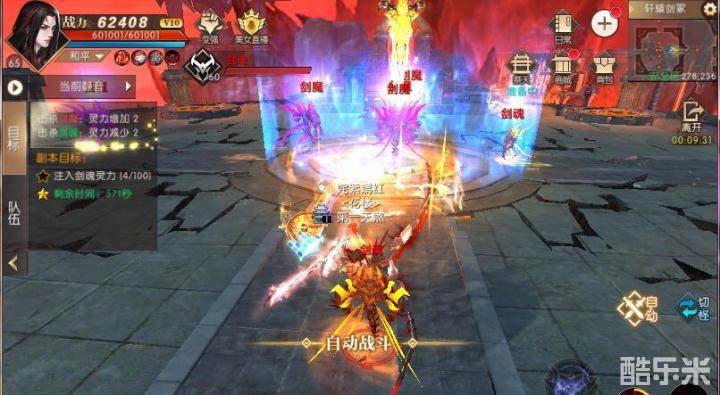 进入剑冢后就会开始计时,查看左侧的副本目标我们可以知道想要完成任务需要在十分钟的时间内向剑魂注入100点灵力,那灵力从何而来呢?不要急,马上就会出现让我们头皮发麻的东西:剑魔,剑魂,很多很多的剑魔和剑魂冲过来了!