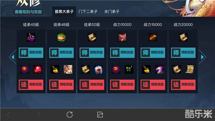 当徒弟战力达到20000,师父可以领取50金票,徒弟可以领取50金票、清缴令(蓝)2个;
