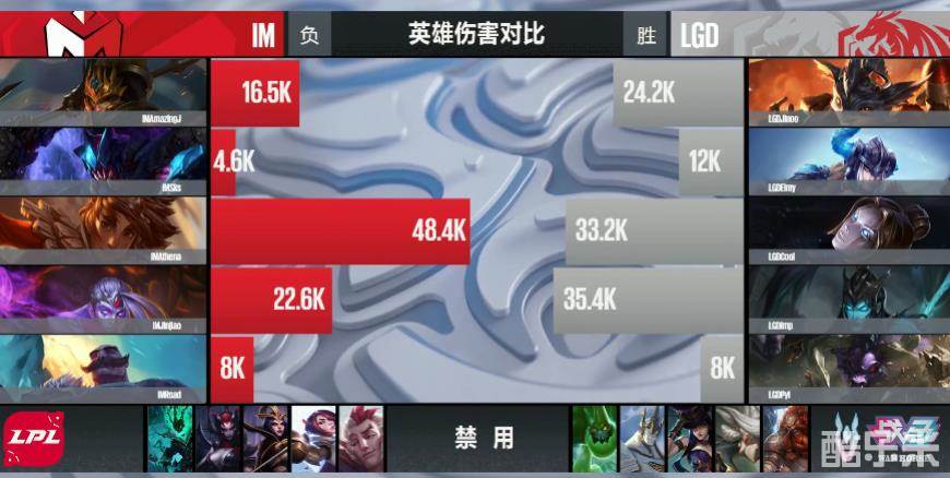 双方打野均是蓝开,IM这一套中路卡牌的节奏阵容,在前期几条线的均是被LGD压制,唯一发育优秀的打野位猪妹,也是难以将队伍前期的劣势扭转。IM在一波针对下路没有取得成效的情况下,局面越来越遭,而LGD则是顺风顺水,虽然没有多杀人头和经济的领先,但是局面上已基本处于不败之地。23分钟,LGD在野区抓到机会将IM猪妹击杀,随后轻松推掉IM的中路高地。最终,LGD在大龙处埋伏,一路追击到IM高地将其团灭,随着中路来到的超级兵,LGD顺势一波结束了比赛,拿到比赛的胜利,恭喜LGD!