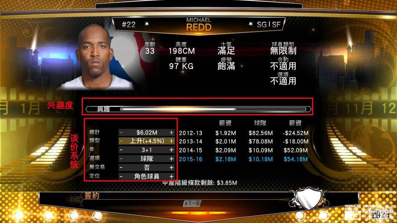 薪资:工资总额。随着年期和涨幅度的变化而变化,你可以手动减少或增加。右侧的数据可以表示出球员每年的薪金变化值,以及球队的工资总额和薪金空间。
