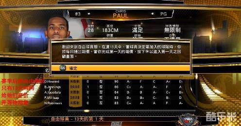 2、当然每到一个赛季结束后,都会有一些好球员合同到期成为了自由球员,你可以在总决赛结束之后的休赛季工作时进入签自由球员的页面,这时你可以去找一找有没有你想要的(图27),可以想办法签进这些好球员,赛季后签自由球员不是马上出结果,而是有13天的等待期,你需要在薪资空间允许的情况下给他们开价,开完了价就要在13天当中等待对方的回复,如果他同意了,那么会弹出他同意的页面,如果你自己反悔了,你也可以选择拒绝签约。