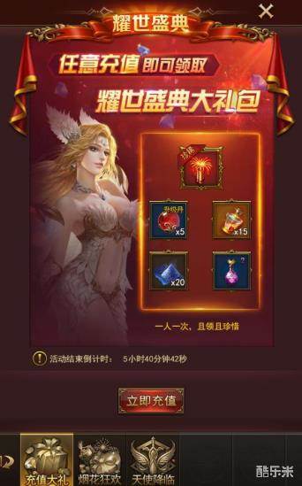 活动期间充值任意金额可领取丰厚的奖励,活动期间每人仅可领取1次,