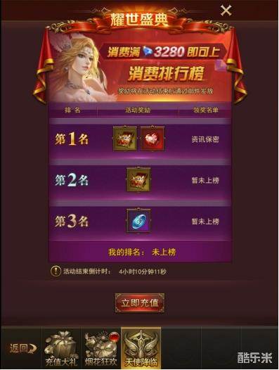 活动期间消费钻石达到3280钻石以上并且本服消费前三名的玩家可以获得以下道具: