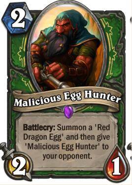 战吼:召唤一个红色龙蛋,继而将狠毒的猎蛋人交给对手。