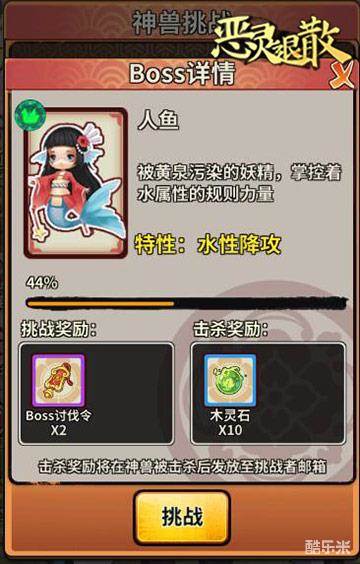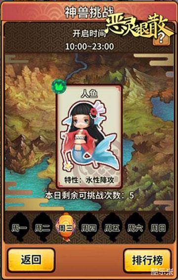 《恶灵退散》神兽挑战活动每日10点到23点开启,每日有5次免费挑战的机会,并且每日挑战的神兽也不同。参与神兽挑战,即可获得指定道具奖励,当今日神兽被击杀时,参与挑战的玩家都可获得指定奖励。根据对神兽的总输出伤害值进行排行,显示在神兽伤害排行榜,每周一凌晨刷新排行榜并发送奖励,奖励包括丰富的式神碎片、勾玉、宝箱等,排名越靠前的玩家得到的奖励越多。