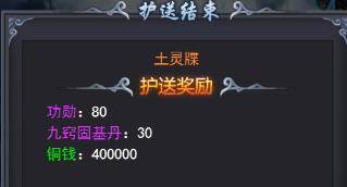 这边是我土灵蝶的护送的奖励,80功勋,固基丹30个,铜钱40W。