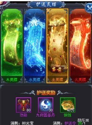 点击护送灵蝶后随即活动一件灵蝶。从左向右灵蝶的品阶越来越好,奖励也越来越好。一件刷红消费80元宝直接百分百获得火灵蝶的护送权。而右边的刷新品质,点击后通过刷新护送令可以让刷新可护送的灵蝶。直接刷到自己想要的品阶而已。