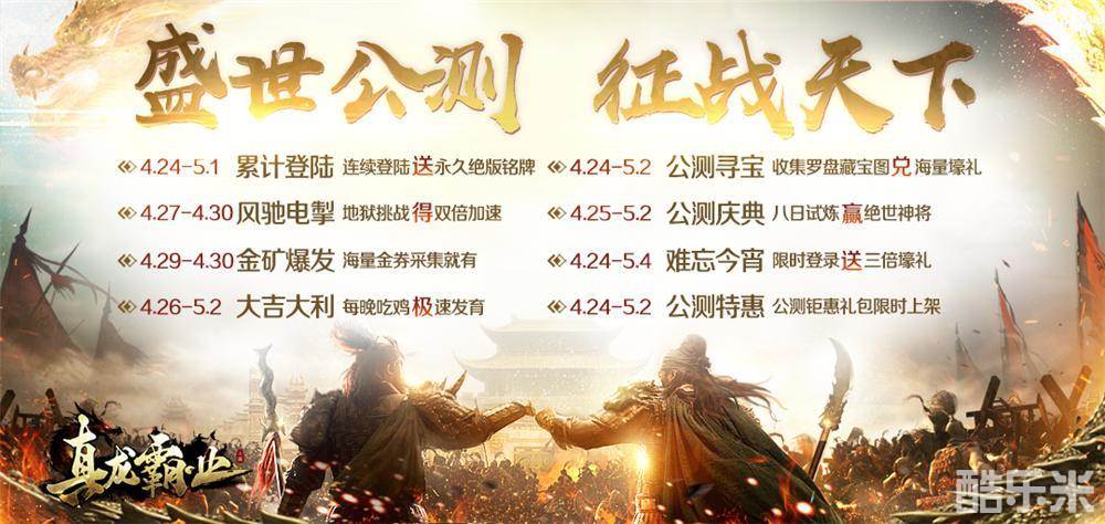 为庆祝《真龙霸业》正式公测,游戏运营方特推出多项丰厚福利活动,回馈各位主公玩家。自公测庆典活动开启之日起,玩家每天登陆游戏均有壕礼相赠,连续登陆更赠送永久绝版铭牌。公测庆典期间,完成八日试炼活动可赢取绝世神将,地狱挑战获得双倍加速奖励,更有公测寻宝活动,收集罗盘藏宝图可兑换海量豪礼。每晚8点开启的“难忘今宵”活动,公测期间限时登录将有三倍壕礼赠送;“大吉大利”礼包上线,助各位主公极速发育;“金矿爆发”,海量金券采集就送。与此同时,全新公测钜惠礼包也将限时上架,欢迎各位主公购买。
