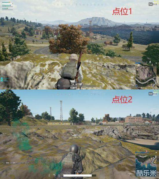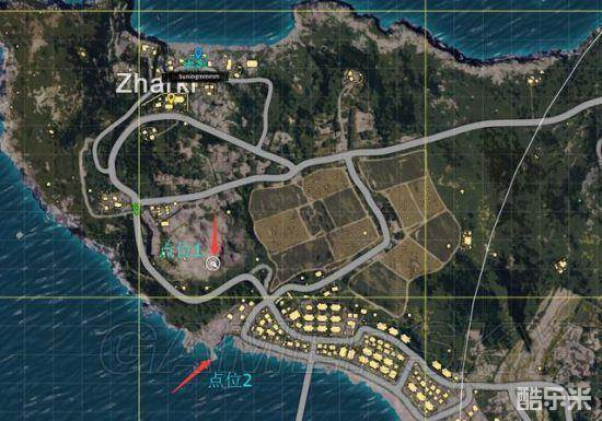 从Z城出来后可以在绿色标记的位置补充点瞄具或者子弹补给,然后通过石头山的点位1位置利用海拔优势观察上城区。