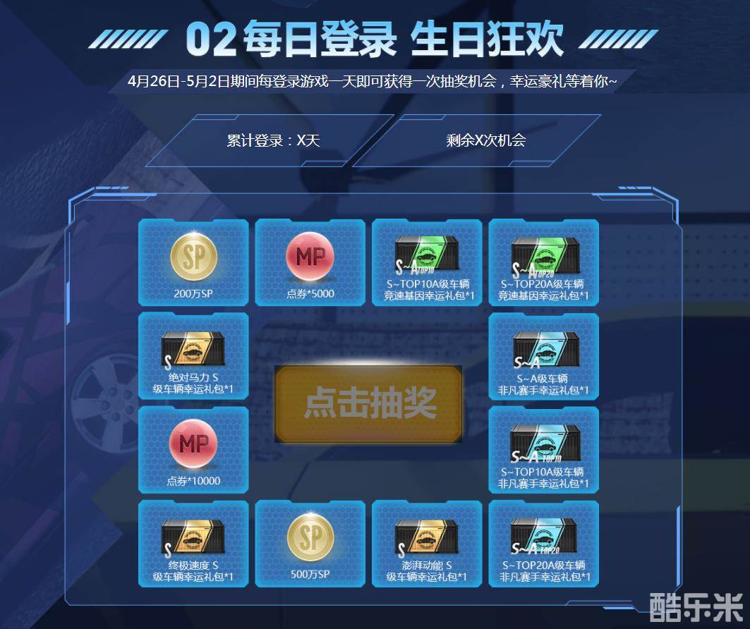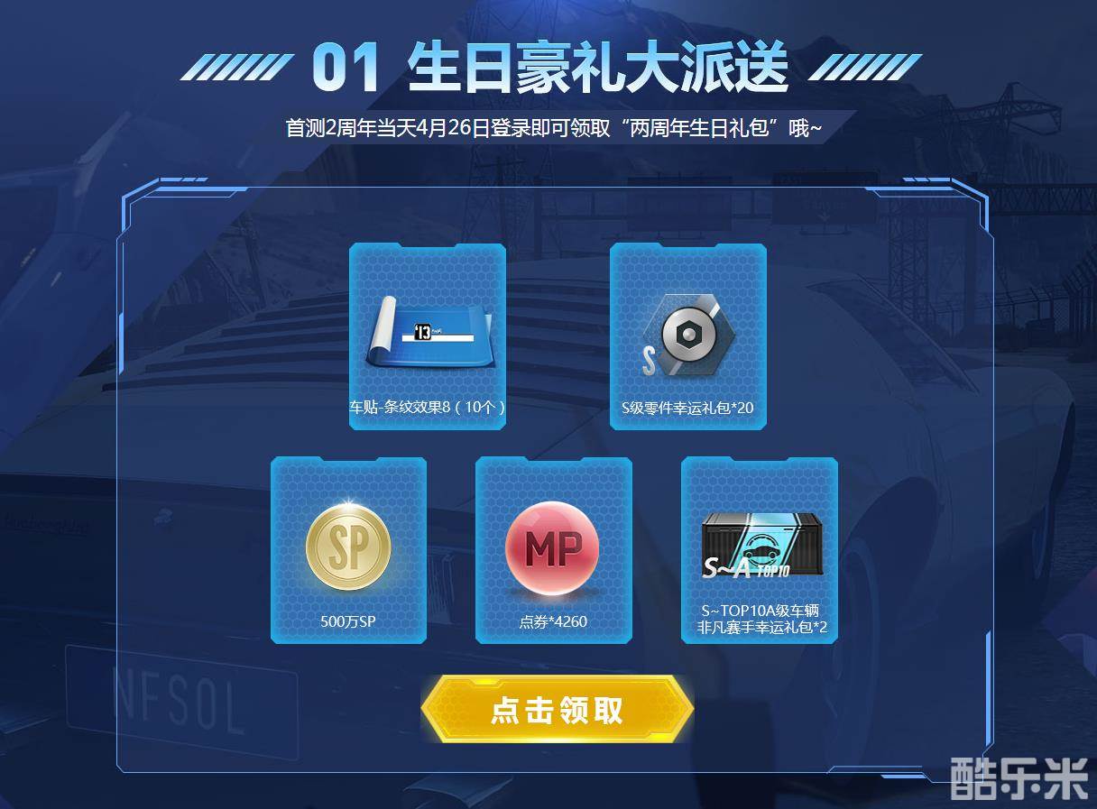 首测2周年当天4月26日登陆游戏即可领取“两周年生日礼包”哦,包含车贴-条纹效果8(10个)、S级零件幸运礼包x20、500万SP、4260点券和S~TOP10A级车辆非凡赛手幸运礼包x2。