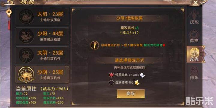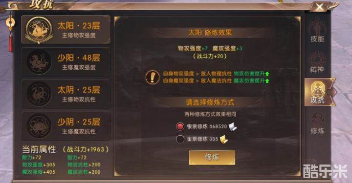 抗性的升级可以根据对手的类型进行选择,而强攻的升级方面,太阳以提高物攻强度为主,魔攻强度为辅,少阳以提高魔攻强度为主,物攻强度为辅,太阳和少阳的加点可以根据自己的需求以及经济性来衡量加点,这样可以充分利用有限的银票金票提高更多的强度。好了,今天的攻抗技能就给大家介绍到这里,更多精彩资讯请继续关注轩辕传奇手游!