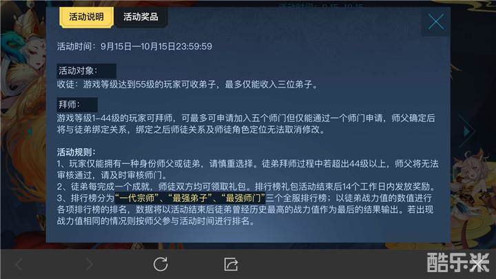 当徒弟战力达到20000,师父可以领取50金票,徒弟可以领取50金票、清缴令(蓝)2个;