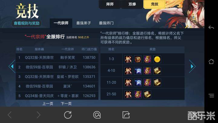 一代宗师榜单是在全服进行排名,统计师父名下所有徒弟的战力值总和进行排名,根据排名,师父可以获得不同的奖励。最强弟子是在全服进行排名,将所有徒弟的战力值进行排名,根据排名,徒弟可以获得不同的奖励。最强师门是在全服进行排名,将统计师父名下所有徒弟的战力值总和,根据排名不同,师门所以徒弟可以获得不不同的奖励。