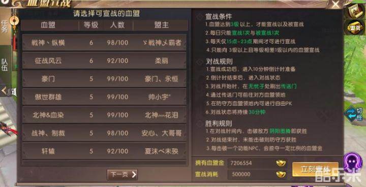 如果血盟当天被其他血盟宣战,在第二天后选择反击可以不消耗任何血盟金,但是第二天反攻哪有防守反击来的实在,所以我们在血盟宣战的时机选择上一定要注意。虽然我们在自己血盟无法直观的感受到敌方血盟到底有多少人在线,但是我们可以根据经验来判断,一般来说中午和晚上时段每个血盟人数较多,但是在下午三四点的时候是每个血盟在线人数最少,挂机人员较多的时段。在这个时段发起血盟宣战未尝不是一个好时机!
