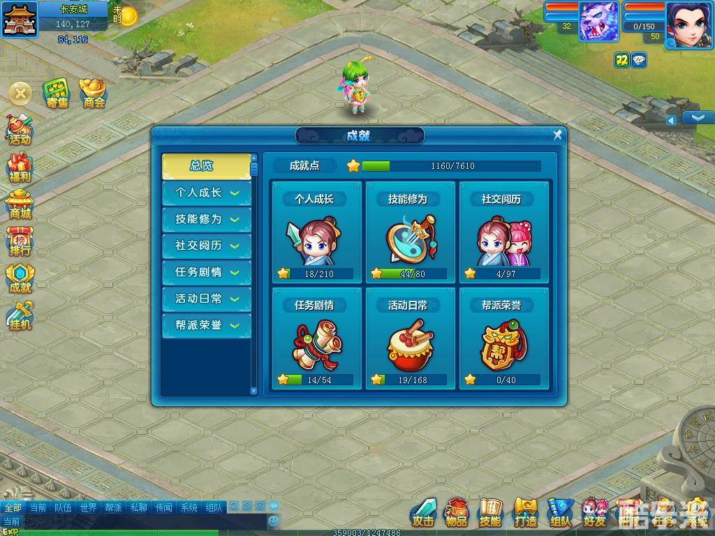 成就系统可通过点击游戏主界面左侧“成就”按钮打开查看,玩家通过按键shift+鼠标左键点击单项成就可发送已完成的成就至聊天栏与其他玩家分享,成就点数越高,在排行榜里的成就排名也就越高。
