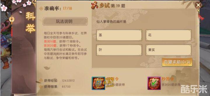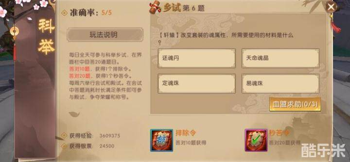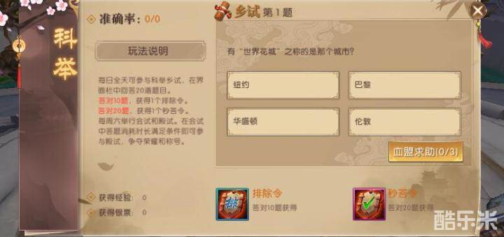 科举考试是轩辕传奇手游中的考试玩法,科举考试分为科举乡试、科举会试和科举殿试,每天都能参与的科举考试就是科举乡试。科举乡试中每天会有二十道题,答对不同的次数可以获得排除令、秒答令奖励。许多勇士认为一些科举乡试的考题不容易找到答案,今天咱们就来看一下科举乡试都会有哪些问题,答案又是什么。