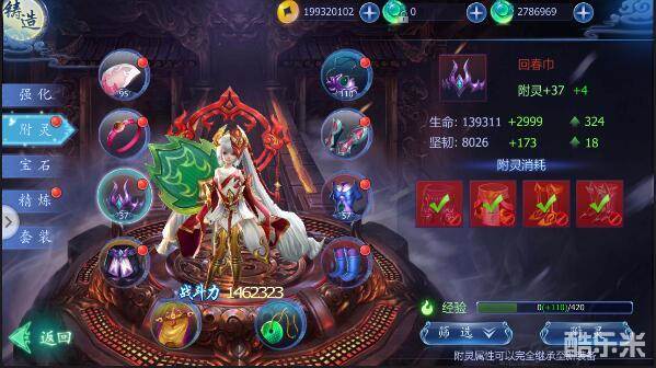 【附灵】装备的附灵可以通过使用附灵石和装备作为材料,提升附灵等级,装备的附灵等级是和人物的等级一样的,人物等级多少级就可以提升附灵到多少等级。装备的附灵是比较容易提升的,仙友们可以通过日常活动获得附灵石或者可以在通过在野外挂机获得低品质装备提升附灵等级,野外挂机时可以在挂机系统设置自动附灵,一段时间就可以发现附灵等级能提升不少的哦。不想挂机的仙友可以在商城中购买附灵石作为材料直接提升附灵等级。