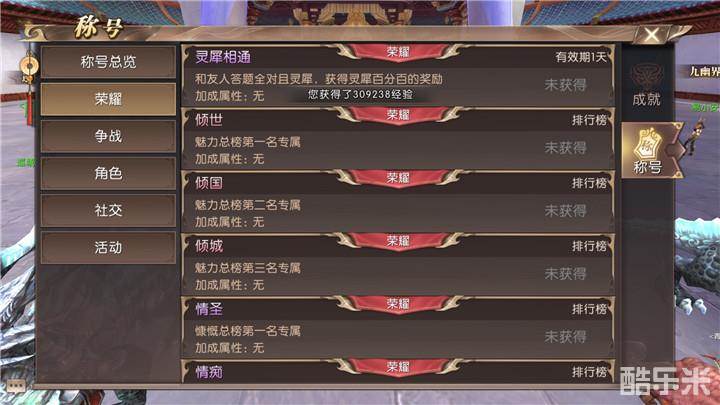 还有一些称号,比如:灵犀相通,和友人答题全对且灵犀,获得灵犀百分百的奖励;护花使者,主播关爱榜第一名专属;驭灵神帝,需要同时拥有东方玉青龙、西琼锦白虎、南宫绯朱雀、北冥圣玄武;最强血盟,血盟排行榜第一名领袖专属;天生领袖,新服十大血盟评选活动第一名领袖专属;一呼百应,新服十大血盟评选活动第一、三名领袖专属。