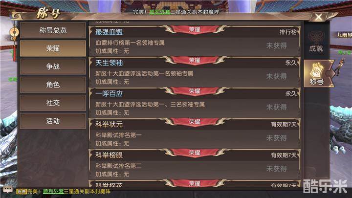 最强血盟、天生领袖、一呼百应,是针对血盟的称号。科举状元、科举榜眼、科举探花,是针对科举殿试的称号。众志成城、肝胆相照、同力协契,是对于小队通天塔的称号。当然还有一些杂散的称号,比如:护花使者、驭灵神帝、灵犀相通。