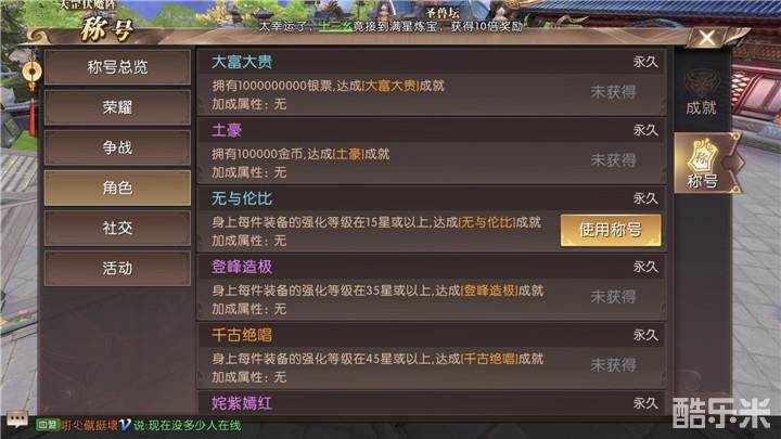 大富大贵需要拥有1000000000银票、土豪需要拥有100000金币。