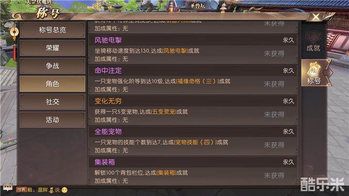 命中注定需要一只宠物强化阶到达10级。变化无穷获得一只5变宠物。全能宠物一只宠物的技能个数到达7。至尊至贵获得一只至尊宠物。