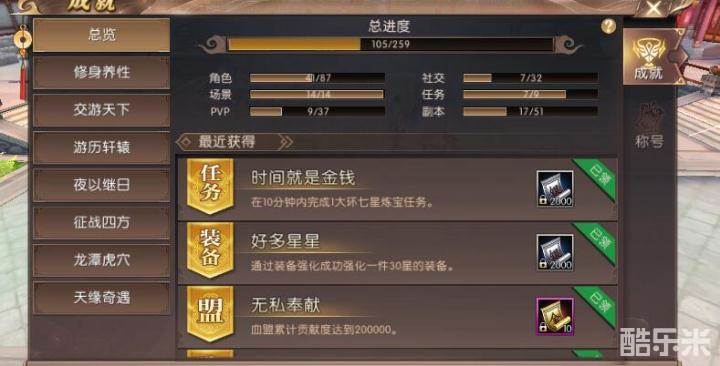 整个成就系统可以分为成就和称号这两个门类。我们可以在成就界面上看到非常多的信息:角色成就完成度,社交成就完成度,场景成就完成度,任务成就完成度,PVP和副本完成度等。点击称号按钮可以切换到成就系统称号分类下,在称号分类中我们可以看到荣耀、争战等栏目,可以说在称号获得这个方面,每个子系统都有自己独特的方式。