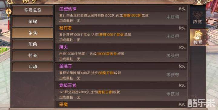 争战分类中可以获得多个称号,总体来说可以将争战称号分成几类:第一类是击杀累计数量类称号。例如血盟战神称号需要累计击杀其他血盟玩家并挂旗1000次,猎耳者称号需要累计获得1000个耳朵,耳朵则是击杀其他血盟管理人员才能掉落的。屠夫称号需要累计击杀10000个勇士才能获得的称号,所以说累计击杀类称号都是大家需要靠一点一滴去努力积攒完成。
