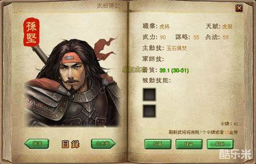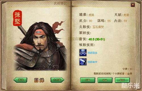 招募武将时,可以对招募到的武将进行刷新。刷新可以获得不同初始资质的武将,同时武将也有可能领悟0-2个初级技能。刷新武将需要消耗一个“令牌”,“令牌”可以通过“平寇”获得。刷新出来的武将,如果觉得不好,可以再次刷新,但是每个武将,只能拥有一个。