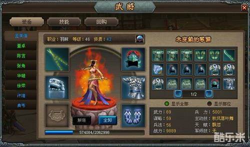 除了未开放的时装位,每个武将可以穿戴五件装备。