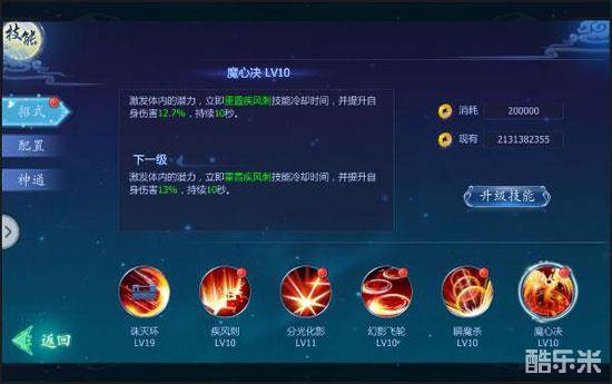 【PK技能搭配】:在PK中推荐技能可以选择分光化影、幻影飞轮、瞬魔杀和魔心诀,魔心诀增加百分比伤害,幻影飞轮和瞬魔杀有控制通知伤害也不俗,分光化影则是化作幻影,让敌人摸不着头脑,达到出其不意的效果。