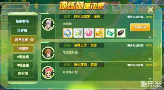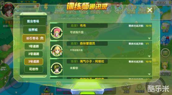 训练师通讯录里可以看到子目录有昆虫、岩石、青草、幽灵四大考场,另外加上世界城,均可以在训练师通讯录里查看和找到,这里也和主线任务的完成息息相关。