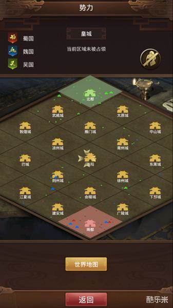 皇城的势力范围内有20座名城与4座都城,其中心为洛阳,归属于群雄势力。三个国家势力的国王都可以对都城发起国战,胜利后立即占领为本国都城,当三个国家确立自己的都城后,群雄势力将会登场,将最后一座都城变为最高等级,并且对三国势力发动战争