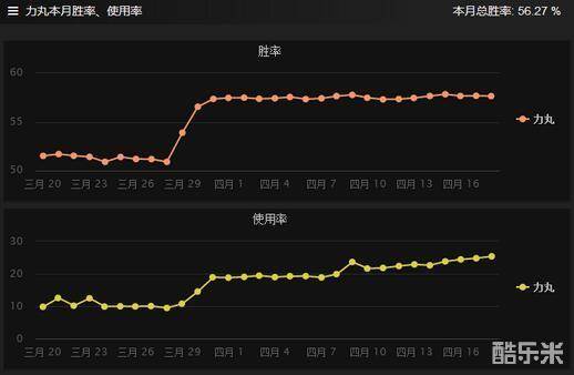 随着分段的上升力丸的胜率逐渐下降,但力丸总体的发挥还是非常不错的。即便是在5000分以上的路人局他的胜率也保持在50%以上,算是一个比较扎实的英雄。他的出场能极大地消耗对方辅助的资源(无论反隐道具的使用多么有效率);而且到了大后期,力丸可以单杀掉很多脆皮。