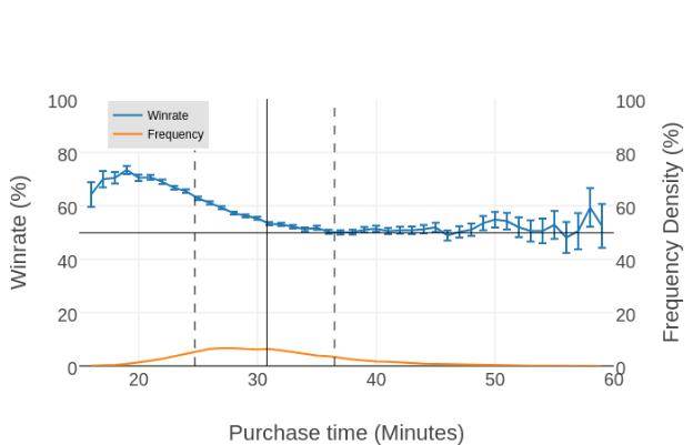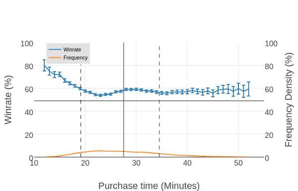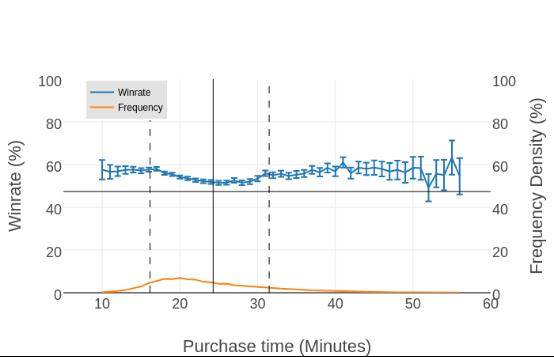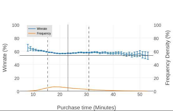 大部分其他英雄的胜率-出装时间图像都会和上图很相似。不可预测的数据通常出现在游戏极早期和极晚期。